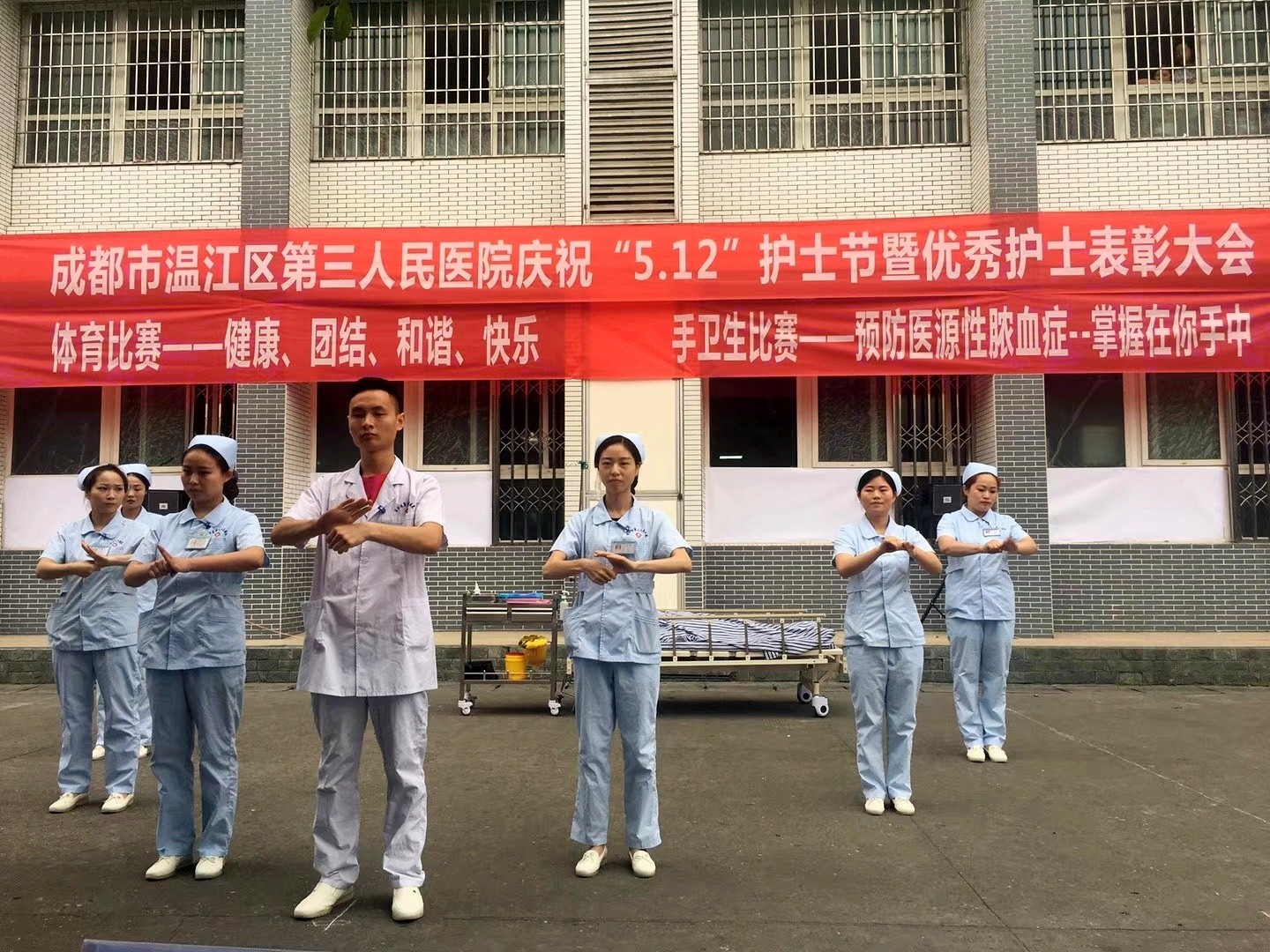 在以“预防医源性脓毒血症—掌握在你我心中”为主题的手卫生宣传比赛中,各科室分别以舞蹈、情景剧等形式宣传正确洗手的重要性,展现了医护人员多才多艺的技能特长和热爱工作、积极向上的精神面貌;在接下来的团体体育比赛中,医护人员用青春与活力推动庆祝活动进入高潮,表现出了良好的体育道德风尚和奋勇争先的竞争意识及团队拼搏精神;在表彰颁奖环节中,表彰了获得2018年度“优秀护士”称号的19名护士,对获得本次比赛一、二、三等奖的医护团体进行了颁奖。