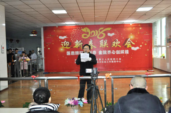 2018年春节即将到来,为纪念充实、辛苦、振奋、辉煌的2017年,迎接充满挑战与机遇的2018年,2018年2月6日下午,区第三人民医院举行了一场以“医患辞旧迎新春 全院齐心创辉煌”为主题的迎新春联欢会。全院住院患者、医院全体职工和社工组织共计500余人欢聚一堂、同庆佳节。区民政局机关党委书记黄俊、区救助站站长余彬等相关领导到场祝贺并为受助病患送来慰问。